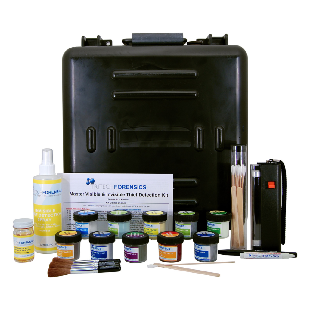 ¡El kit forense de seguridad definitivo para la identificación de sospechosos! Este kit multipropósito de TRITECHFORENSICS contiene una selección completa de materiales de detección visible e invisible, diseñados para identificar a ladrones, falsificadores o personal deshonesto.