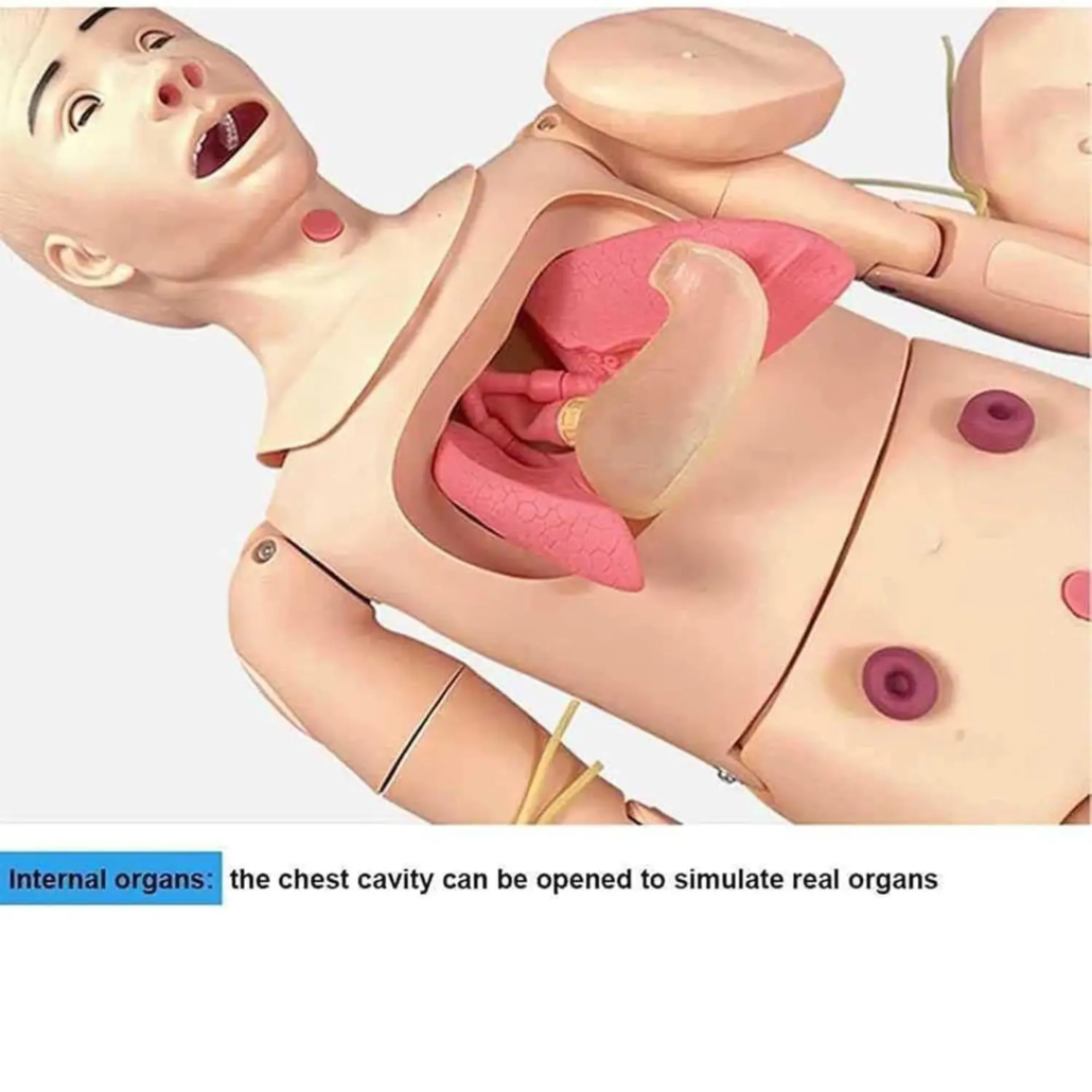 - Órganos Internos Simulados: La cavidad torácica puede abrirse para simular órganos reales, facilitando la práctica de procedimientos como el lavado gástrico, la estructura de órganos abdominales y la punción lumbar.