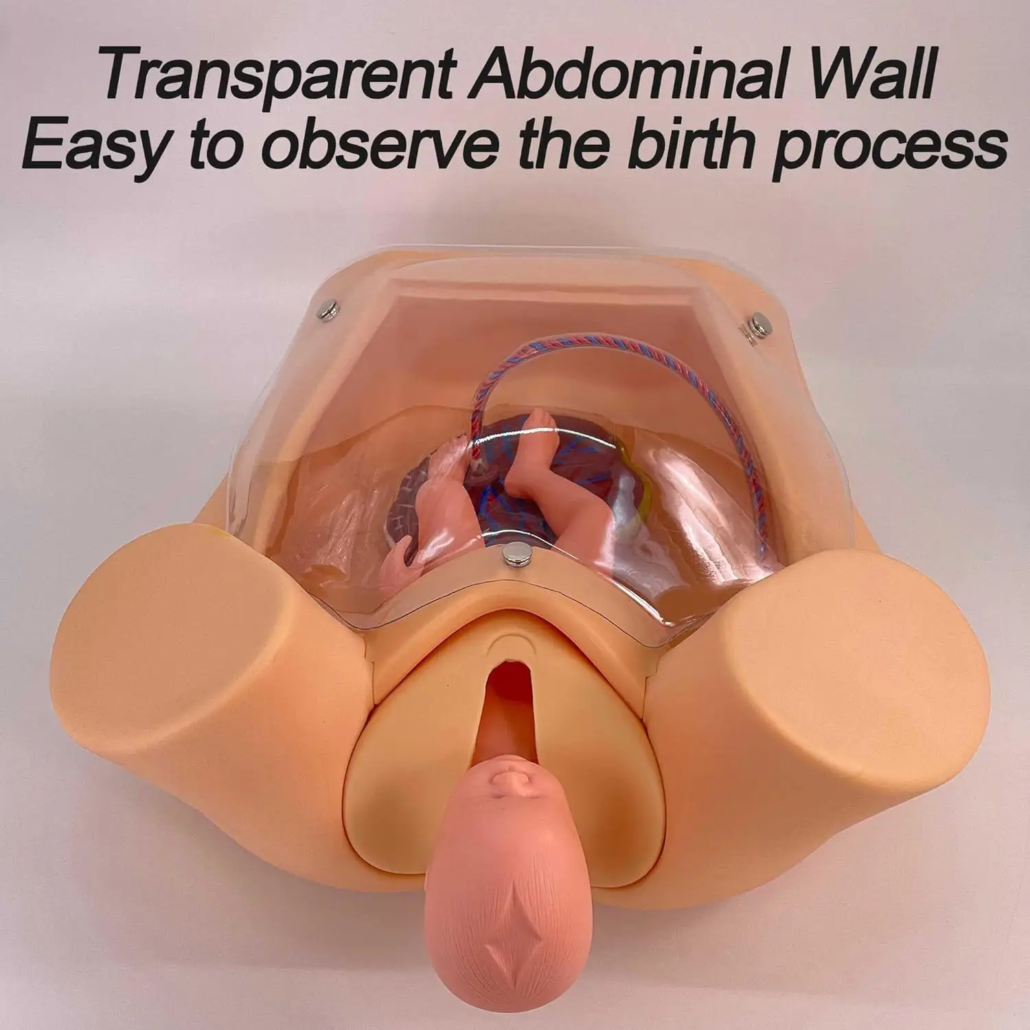 - Pared Abdominal Transparente: El abdomen del modelo incluye una pared abdominal transparente y piel simulada. Esto facilita la observación de la demostración de la función de parto y la relación posicional entre la cabeza fetal y el plano de la espina isquiática en las 6 etapas del parto.